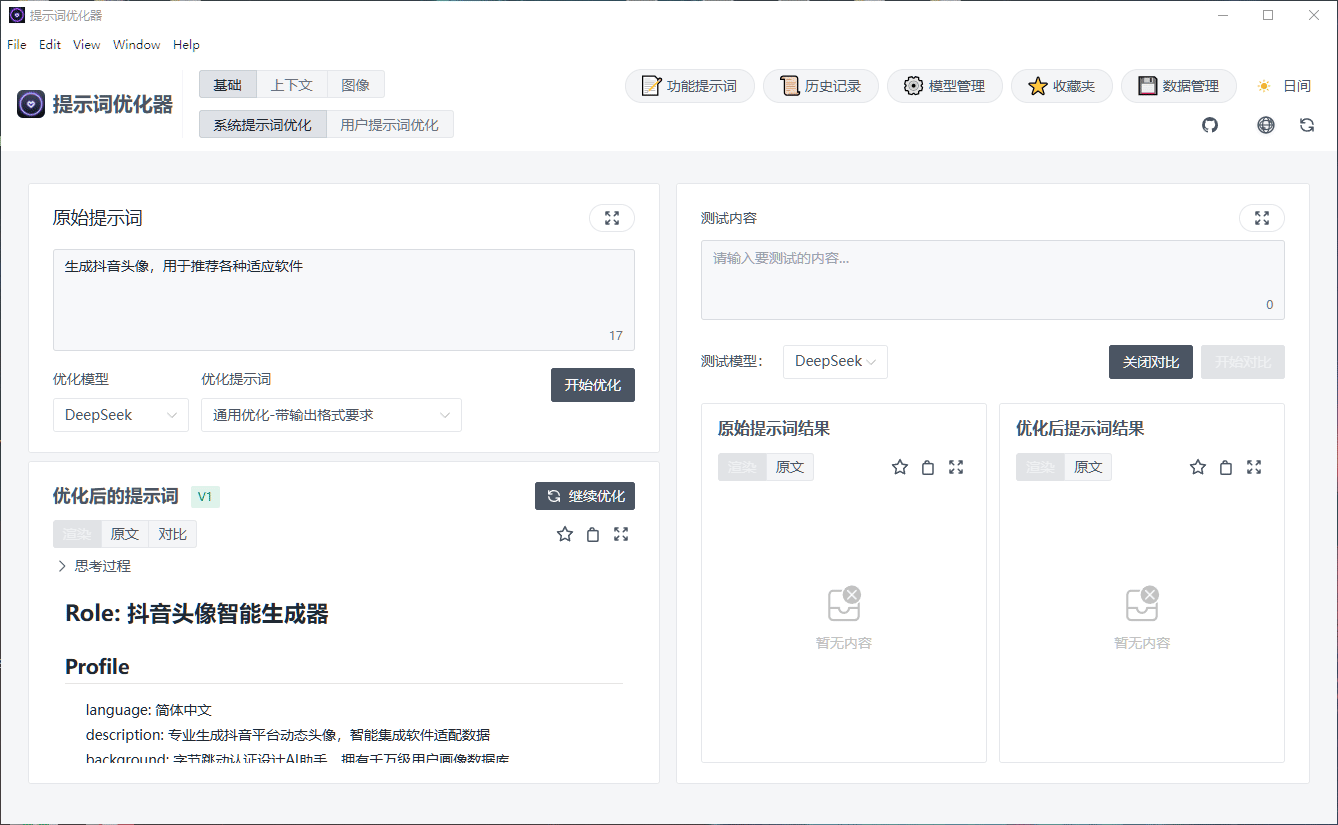工具支持系统提示词优化和用户提示词优化双模式,通过多轮迭代改进提示词结构。用户可实时对比原始与优化后提示词的效果,直观评估优化提升。