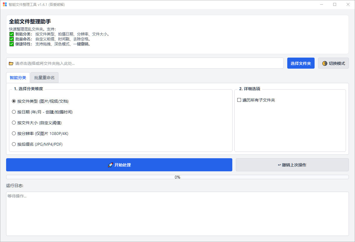 智能文件整理工具 V1.4.1是一款兼顾高效与安全的图形化桌面文件整理工具,核心支持智能分类与批量重命名两大核心功能,操作直观无需代码,多线程处理不卡顿,还能防文件覆盖、支持撤销,帮你快速理清杂乱文件,提升管理效率。
