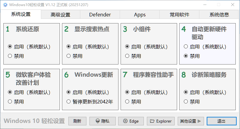 该工具可一键禁用系统还原、关闭搜索热点、禁用小组件、暂停 Windows 更新(最长可暂停至 2042 年),还能管理硬件驱动更新,将复杂的系统设置操作简化,轻松规避更新带来的各类麻烦,让桌面更简洁高效。