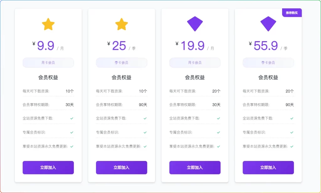| 会员类型 | 价格 | 每日下载量 | 有效期 | 专属权益 |