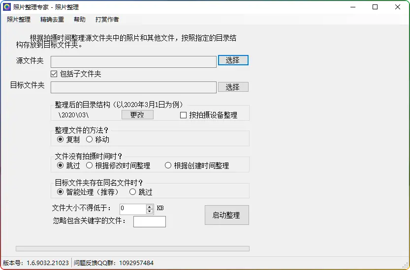 整理时可灵活配置:支持选择是否包含子文件夹、设置文件大小阈值、忽略含指定关键字的文件;针对无拍摄时间的文件,可选择跳过、按修改时间或创建时间整理;遇到同名文件时,推荐使用智能处理模式。