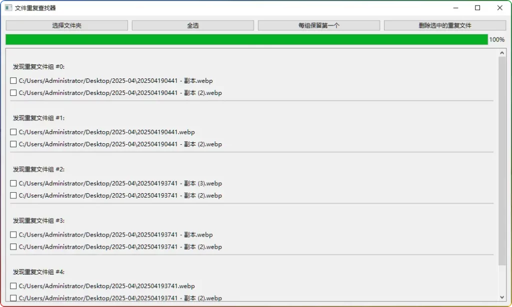 - 查看重复文件:扫描完成后,重复文件会按组显示,每组文件都有清晰的标记和复选框,你还能看到文件的完整路径,方便确认文件位置。